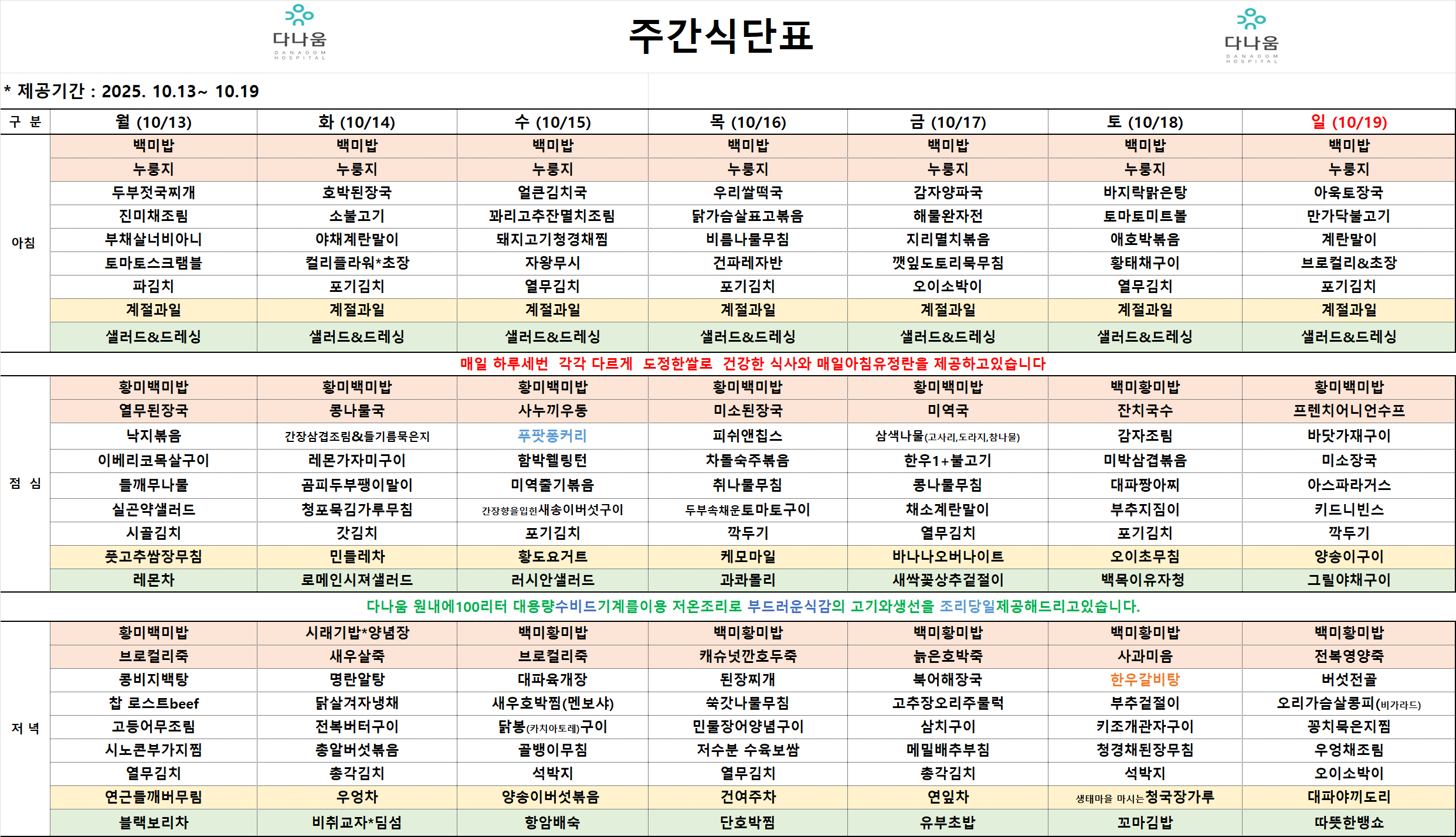 25년 10월 13일 ~ 25년 10월 19일 주간식단
