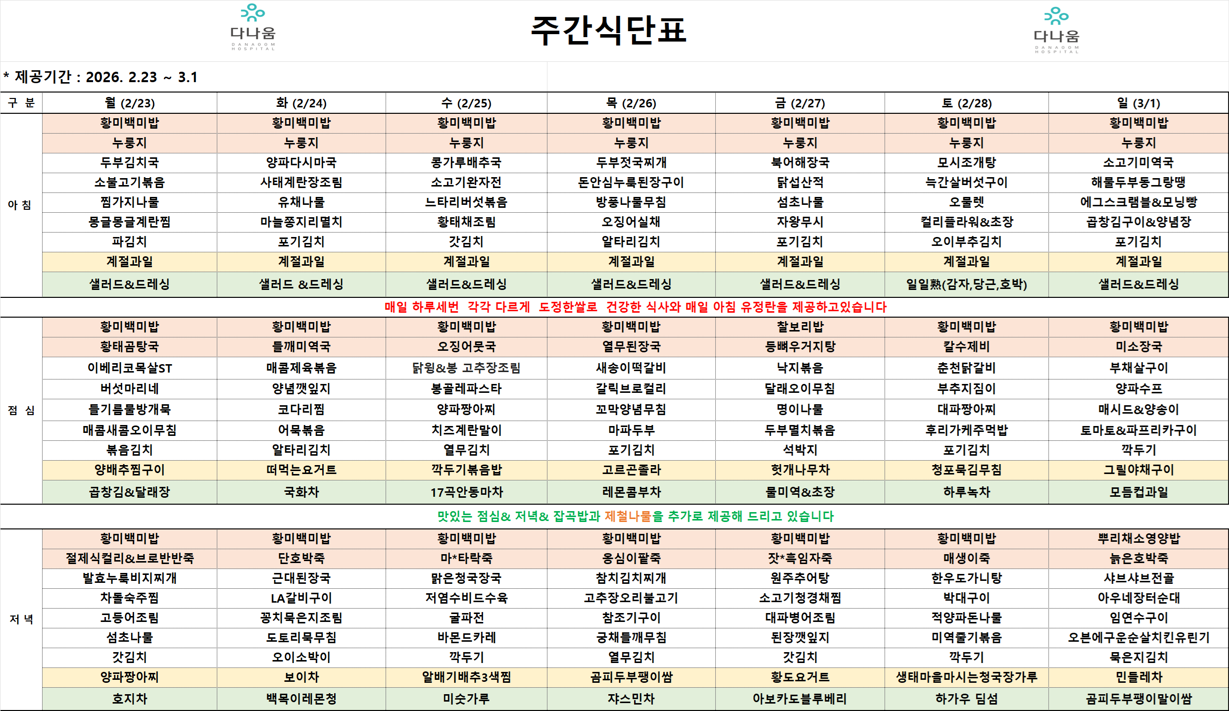 26년 2월 23일 ~ 26년 3월 1일 주간식단